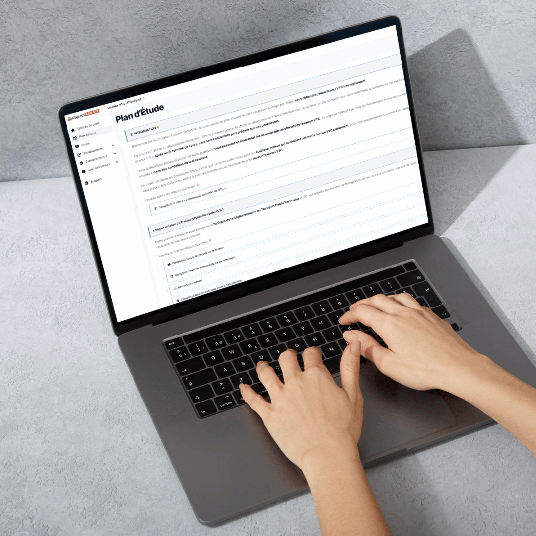 Objectif TAXI-VTC, ce n’est pas qu’une simple préparation en ligne : c’est un accompagnement complet pour réussir votre examen VTC.. La préparation est 100 % en ligne, accessible depuis un PC, Mac, smartphone ou tablette. Vous vous entraînez dans des conditions proches de l’examen théorique, directement sur notre plateforme. Pour des conditions optimales, nous vous recommandons toutefois de privilégier un entraînement sur ordinateur. Que vous soyez inscrit dans un centre agréé ou candidat libre, complétez votre formation grâce à notre plateforme d’entraînement. Une fois l’épreuve théorique réussie, vous pourrez préparer l’épreuve pratique avec l’organisme de votre choix ou en candidat libre, notamment via la location d’un véhicule à double commande.