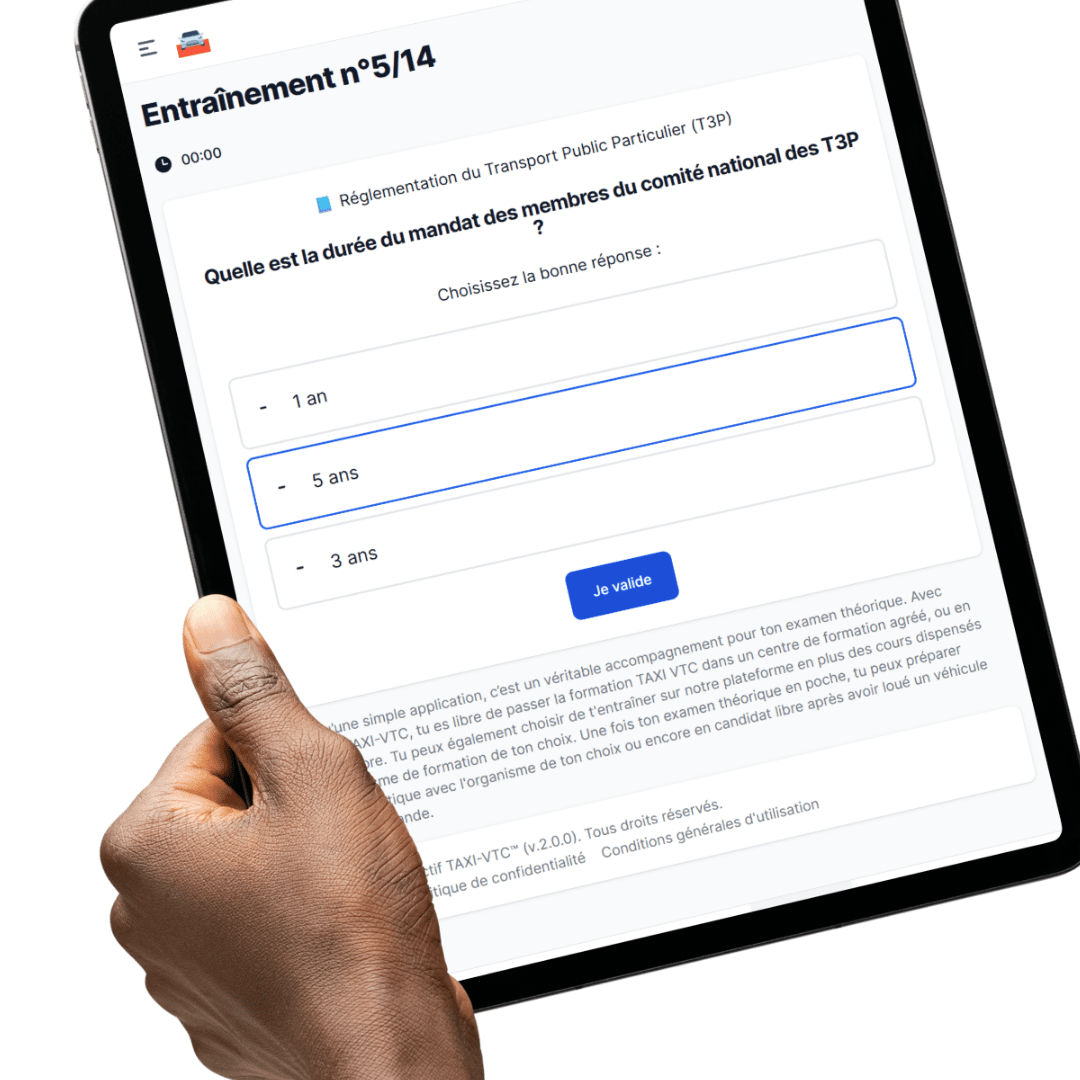 Elles sont très proches du niveau et de l’esprit de l’examen VTC. Nos formateurs disposent d’une solide expérience dans la préparation aux examens organisés par les Chambres de Métiers et de l’Artisanat (CMA). Nous nous appuyons notamment sur l’analyse des précédents examens des CMA, afin de vous proposer des questions représentatives des thématiques réellement évaluées. Notre équipe maîtrise précisément ce que l’examen T3P teste — et ce qu’il ne teste pas — pour vous concentrer sur l’essentiel et éviter toute perte de temps dans le cadre de votre préparation à l'examen TAXI.